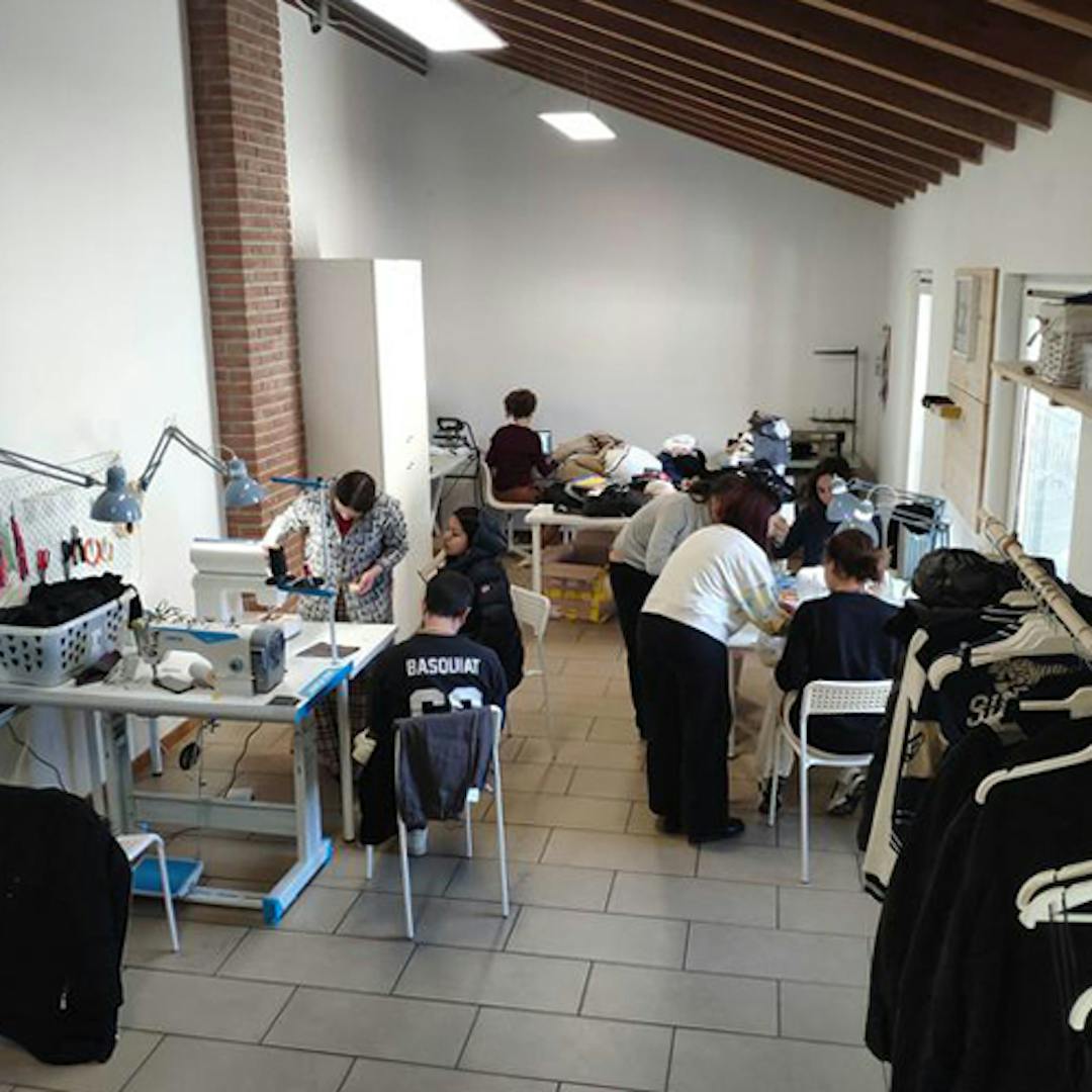 Ed è in questo momento che entra in gioco Teddy. Due volte all’anno, infatti, a fine di ogni collezione, l’azienda autorizza la consegna dei capi difettosi: quegli indumenti o accessori che hanno delle imperfezioni e che non possono essere destinati alla vendita. Ora questi capi arrivano nelle sapienti mani delle mamme che sono ospitate dalla cooperativa, che li rigenerano dandogli nuova vita. «Mia moglie», continua, «mi ha proposto l’idea di creare una sartoria dove le donne della Cascina Cantalupo potessero lavorare sui capi difettosi delle collezioni dei brand del gruppo Teddy. Ha coinvolto anche una nostra cara amica, Manuela Scognamiglio, che ha sposato a pieno l’iniziativa e che rappresenta oggi un punto di riferimento fondamentale per l’organizzazione e la gestione del laboratorio». Così, Damiano ha portato avanti la proposta in azienda, facendo tutti i passaggi necessari fino a ottenere l’ok. Oggi, quei capi, che altrimenti sarebbero stati scartati, vengono rigenerati dalle donne della cooperativa e trasformati in nuovi articoli, poi venduti in un outlet sempre vicino a Monza». Teddy, in linea con la propria visione d’impresa, espressa nel Sogno di Vittorio Taddei, ha saputo cogliere il valore sociale di un progetto di questo tipo e ha contribuito alla sua realizzazione, dando vita ad una collaborazione con la Cascina Cantalupo.